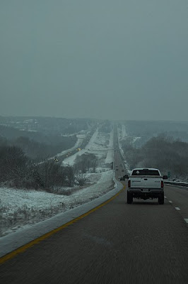Our drive through the middle of Missouri looked like this. When we finally arrived in St. Joseph the temperature was 26. It dropped a few degrees during the night and a bit of snow fell. We left there at about 7:00 a.m. after filling up with gas and getting breakfast sandwiches at Denny’s.