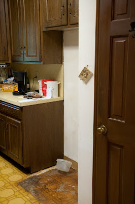 See the ugly yellow floor? I can’t wait till it goes away. And look how nasty the floor is where the refrigerator normally stands. Yuck!