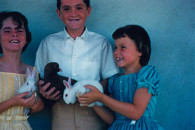 Another Irish, Terry and Kerry picture from years ago. We were dressed in our Easter duds and holding our pets–bunnies and a pigeon. Miss you Ter!