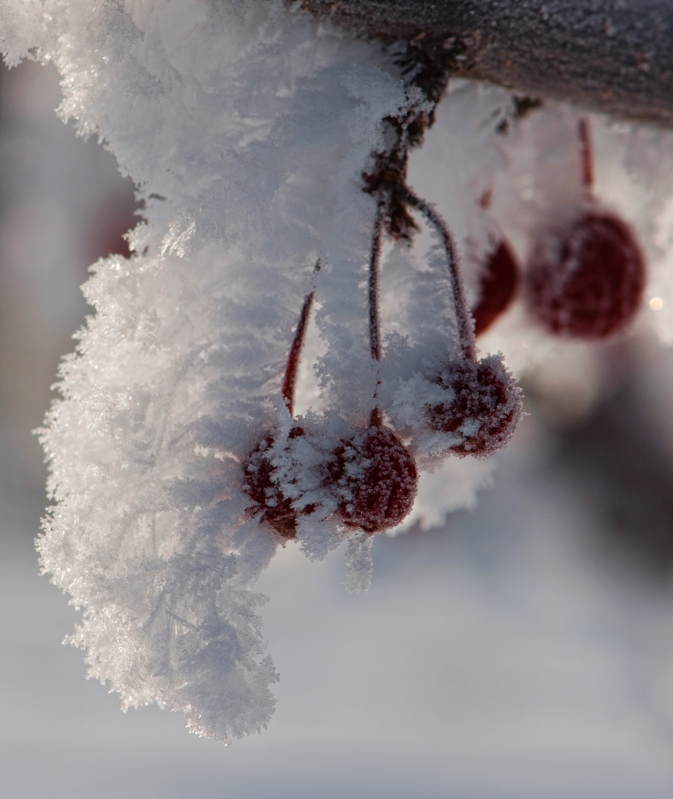 The trees at the park across the street were covered with hoar frost or, as some people call it, rime ice. We took the dogs out for a walk and so that I could take some pictures. I’ve never seen anything quite as gorgeous as these white trees against the beautiful blue sky.